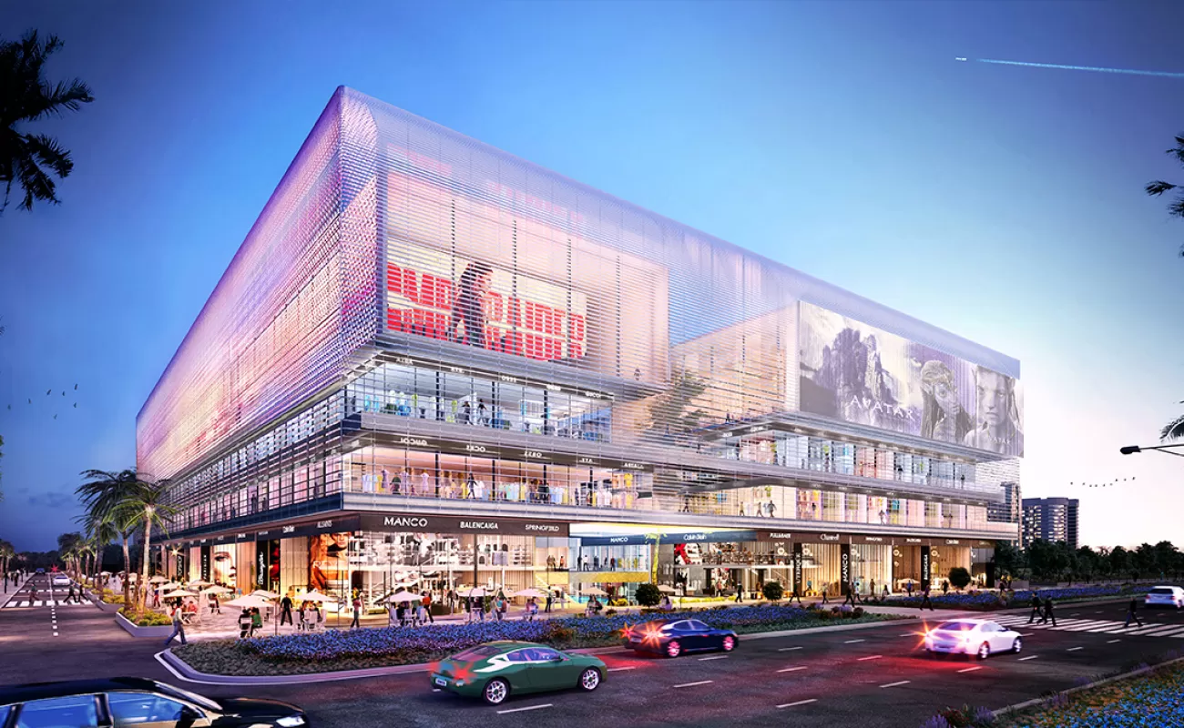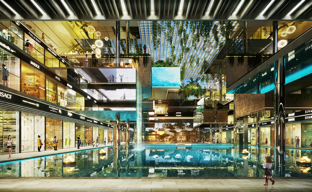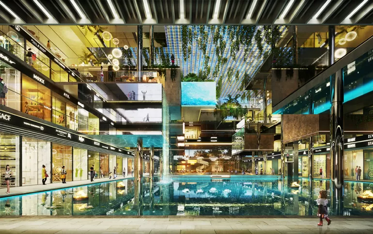 Hanging Retail Pods Showcasing Luxury Brands Surrounded with Dense Residential Projects One of the Biggest Water Body for a Commercial Project
